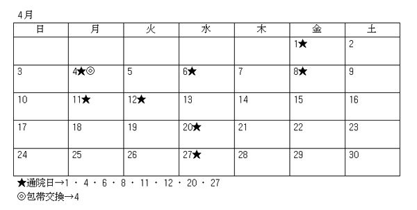 包帯交換は最大で6回の算定になりますので、4日の包帯交換が最終になります。