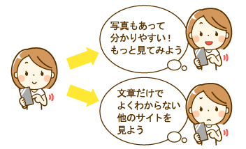 「見出し」と「写真」だけを見て文章を読み飛ばしていく閲覧者の流し読みに対しても、見出しに関連付けた写真を掲載することで、おおまかな内容を伝えることができます。