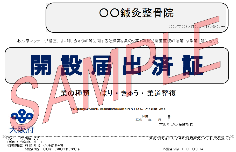 大阪府管轄の施術所に関する証明証についてはこちらよりダウンロードできます。