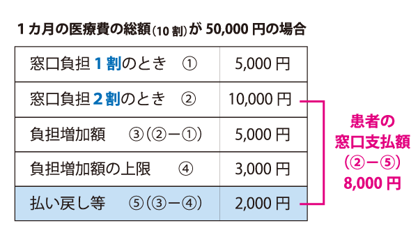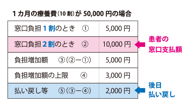 窓口で負担金2割を支払いますが、負担増加額が3,000円に達した場合、窓口負担金が1割になります(同一医療機関に通院中の場合)。