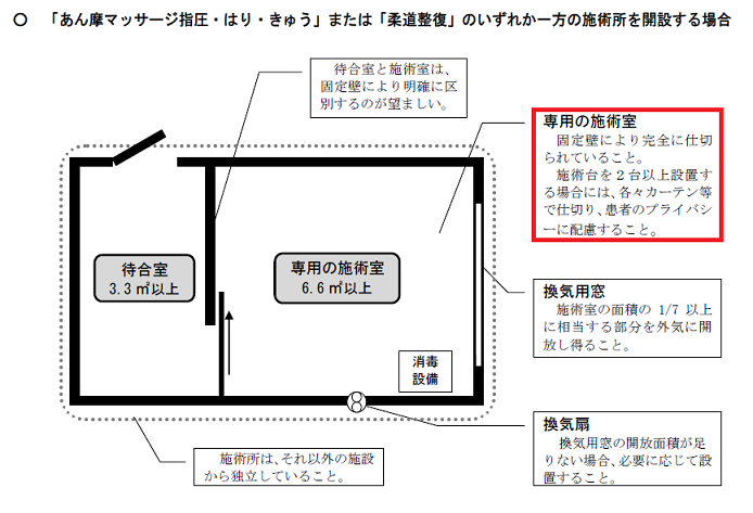1.基本は施術室が2室で各々に構造設備基準を満たすこと。(各々に6.6㎡の施術室、外気解放もしくは換気扇、手指消毒設備)
