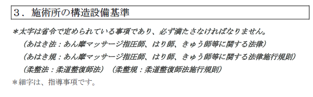 最近では広告制限を大幅に逸脱した施術所が構造設備基準も遵守していないことから、広告制限とあわせて施術所の構造設備基準に対しても厳格化していく保健所が増えてきました。