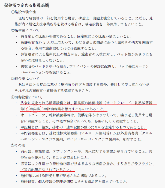 結構、細かい内容となっております。上記の手洗場については、施術室内に設置してくださいと指導を受け、バックヤードの流し場は手洗場として認められないと言う担当者もいました。