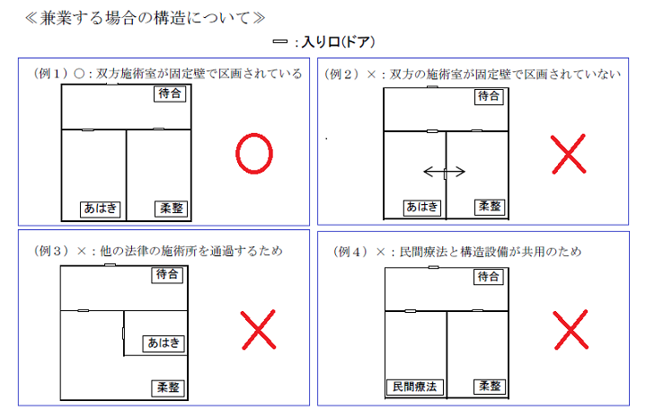 4.柔整師とマッサージ師との兼業も柔整法とあはき法が別なので別室対応となる。