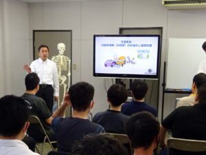 第二部は、交通事故でよくある「むち打ち症」への「エスミス」と「ES-5000」での治療方法について治療機器メーカーの担当者より解説がありました。参加者がモデルになり体感する場面ではビフォーアフターの違いに感嘆する様子が見られ、関心の高さが感じられるセミナーとなりました。受講者からは「とても勉強になりました」「交通事故の患者が来たときはさっそく実行します」「5つの鉄板を元に損保会社への対応に自信が出ました」などのお声をいただきました。