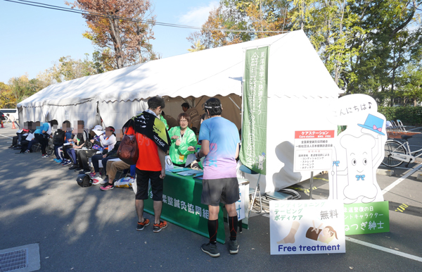 今年からゴール地点が変更され、大阪城公園に全柔協のブースを設け、有志の組合員(柔道整復師)18名と、スタッフ・学生あわせて25名が参加し、約200名以上の方に施術を行いました。