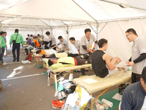 早々にゴールしたランナーは、アイシングやストレッチなどアフターケアとしてブースを利用されていましたが、すぐにベッド10台がいっぱいになり、時間がたつにつれ、膝や大腿部、腰部等、各部位に痛みを伴うランナーが続々と来場し、最大30分待ちの長蛇の列となることもありました。