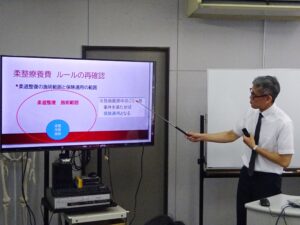 「柔整療養費の基礎講座」では、根拠ある請求ができるよう、保険の適用条件の基本の確認、審査会、面接に関することについて解説を行いました。