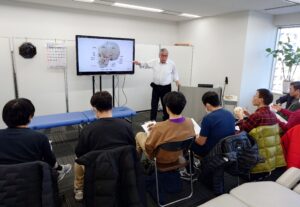 また、生理学・解剖学的視点から、頭蓋骨の動き方や役割についてのメカニズムを学び、その後頭蓋骨モデルを使って、頭蓋骨の各部位のアプローチポイントについて解説いただきました。