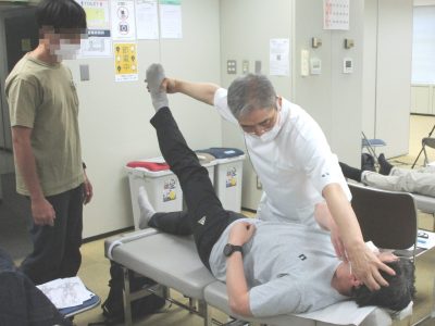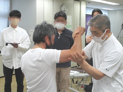 第1回目は、AK治療の基本テクニックについての講習が行われました。はじめに施術の流れに関する説明から入り、講師が普段行っている治療の一連をデモンストレーションされました。講師のこれまでの経験談を交え、筋力を測定しながら患部を探し、施術の際にどのように声がけをされているか等をお話しいただきました。
