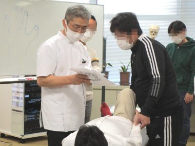実技ではそれぞれのペアがまずお互いを診察し、挙手制で診察内容や気になる点を発表しました。発表した受講者は講師の前で、再度診察した経緯を説明・実践し講師からのアドバイスを受けることで、より理解を深めることができました。