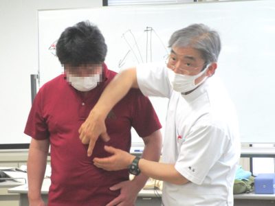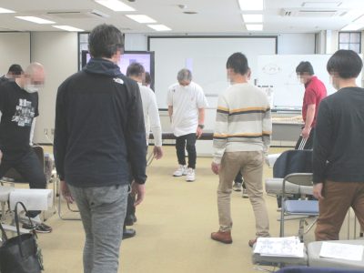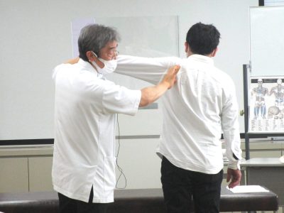 これまでの復習も交えながら、受講者の理解度を確認しつつ進められました。施術についてのテクニックについても多く紹介されており、掛け声に合わせて全員で身体を動かし、動き方を教える場面もありました。受講者からは、手技だけでなく実際の患者の症状についてなど多くの質問が寄せられていましたが、講師は全てにしっかりと回答され、受講者側も講師側も熱心で活気が感じられる講習会でした。