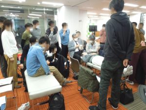 骨模型を用いての手技の説明、実技、次の手技の説明、実技、という流れで、実技が多い講習会でした。受講者は講師の説明に合わせて、自身の頭部や頭蓋骨模型を触りながら確認していました。さらに高度な手技をものにしようと積極的に質問したり手技の確認を求めるなど、真剣に学ばれていました。