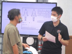 筆記テストでは、一人一人内容が異なるテスト用紙を受講者にそれぞれ配布し、用紙の提出時に実技の内容も含めて、受講者一人ずつに講評されていました。
