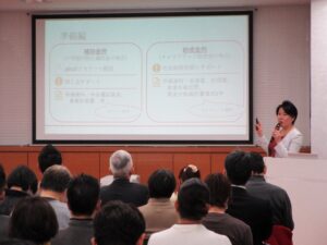 塚原専務理事の講義は、事前に寄せられた質問に現場目線で解説する形で進められました。