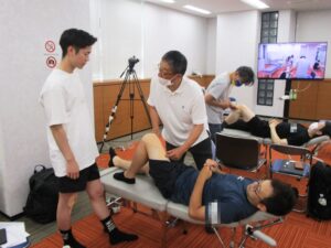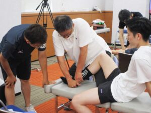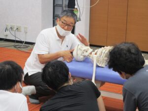 下肢のテーピングでは、痛みを取るためのポイントや貼り方の注意点、患者への声掛けなどについて説明いただきました。