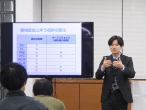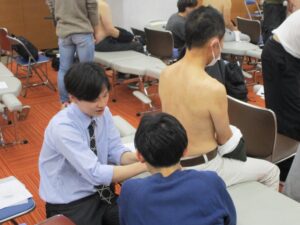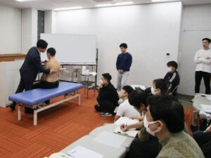 まず初めに、腰椎リスティングについて説明がありました。その後、カイロ特有の記号で表記に少し戸惑われる受講者も見られましたが、受講者はテキストにメモをとっている様子が見られました。「アジャストの際に鳴る音を目的とはせずに、アプローチしたいところに施術を行うことのほうが大切」と伝えられました。