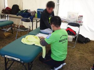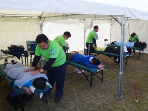 国営海の中道海浜公園(福岡市東区)にて、FM福岡主催の第38回はるかぜマラソン大会が行われました。レース前から施術を求めて来られるランナーが多く、終始大盛況となりました。走り終えたランナーは、特に腰とふくらはぎとハムストリングスの痛みを訴え、参加者は素早く判断をして、一人一人に合わせた施術を行いました。老若男女問わず多くの方に施術を行い、最長35分待ちにもなりましたが、ランナーからは喜びと感謝のお声をいただきました。