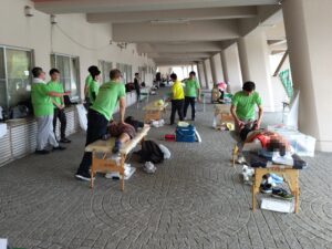 また、今回は3名の学生の参加があり、施術者をサポートしていただきました。また空き時間には、積極的に施術について質問をするなど、学びの姿勢が見られました。そのような学生の姿に、参加者も良い刺激となりました。施術者からは、「経歴に関係なく、先生と学生のつながりを作れてよかった」「スポーツ現場での経験を積めたのがよかった」「学生さんが参加していたことにより、自分も良い刺激となった」等のお声をいただき、学びの多い活動となりました。