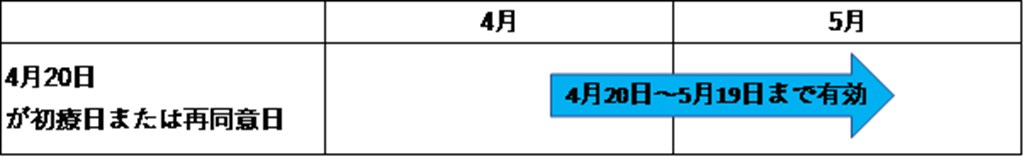 初療の場合は初療日から、再同意の場合は同意日から起算して1ヵ月間有効となります。