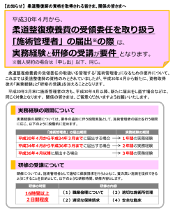 柔道整復施術療養費の受領委任の取扱いを管理する「施術管理者」になるための要件について、これまでは柔道整復師の資格のみとされていましたが、平成30年4月から新たに資格取得後の「実務経験」と「2日間の施術管理者研修の受講」が義務付けられました。