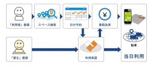 軒先パーキングは、予め定めた時間内で1日単位の貸し駐車場として利用する「駐車場シェアサービス」です。