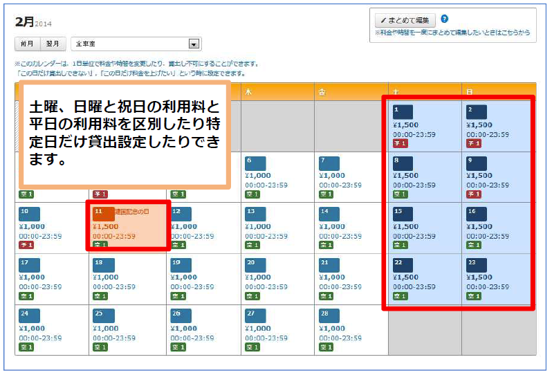 貸し出す日にちや曜日を選択し、料金を自由に変えられます。時間設定も可能なため夜だけや昼間だけの設定もできます。