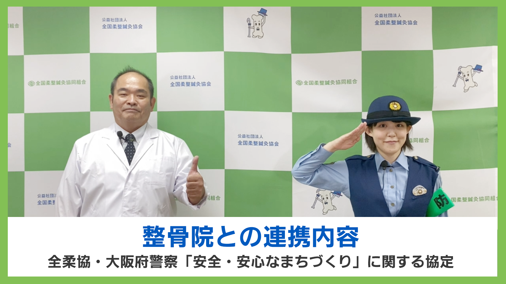 全国柔整鍼灸協同組合(以下、全柔協)と大阪府警察は、相互に連携し、地域住民が安全で安心して暮らせるまちづくりを目指して、「安全・安心なまちづくりに関する協定」を締結しています。